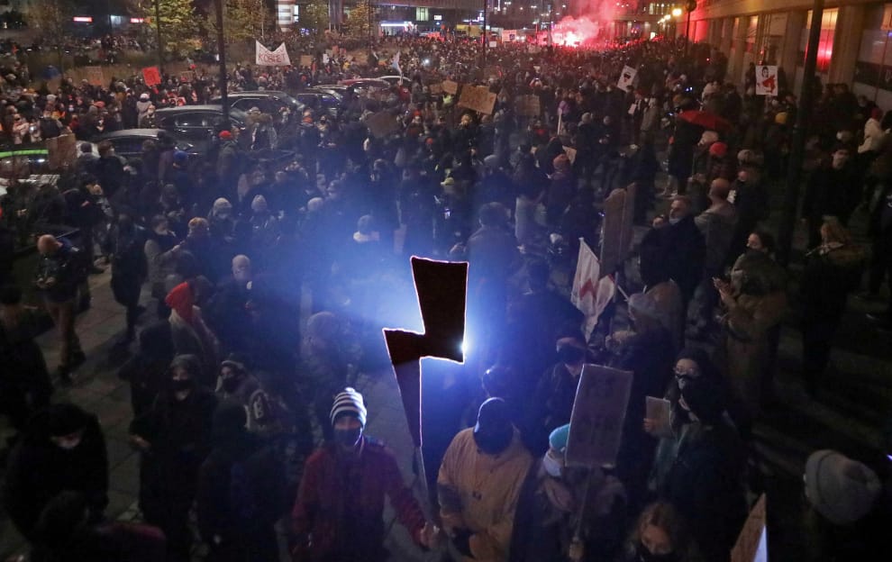 在波蘭首都華沙,示威者們帶著紅色閃電標誌走上街頭,抗議波蘭大法官們近期做出的判決,這項判決將導致波蘭的女性們難以在境內合法墮胎。