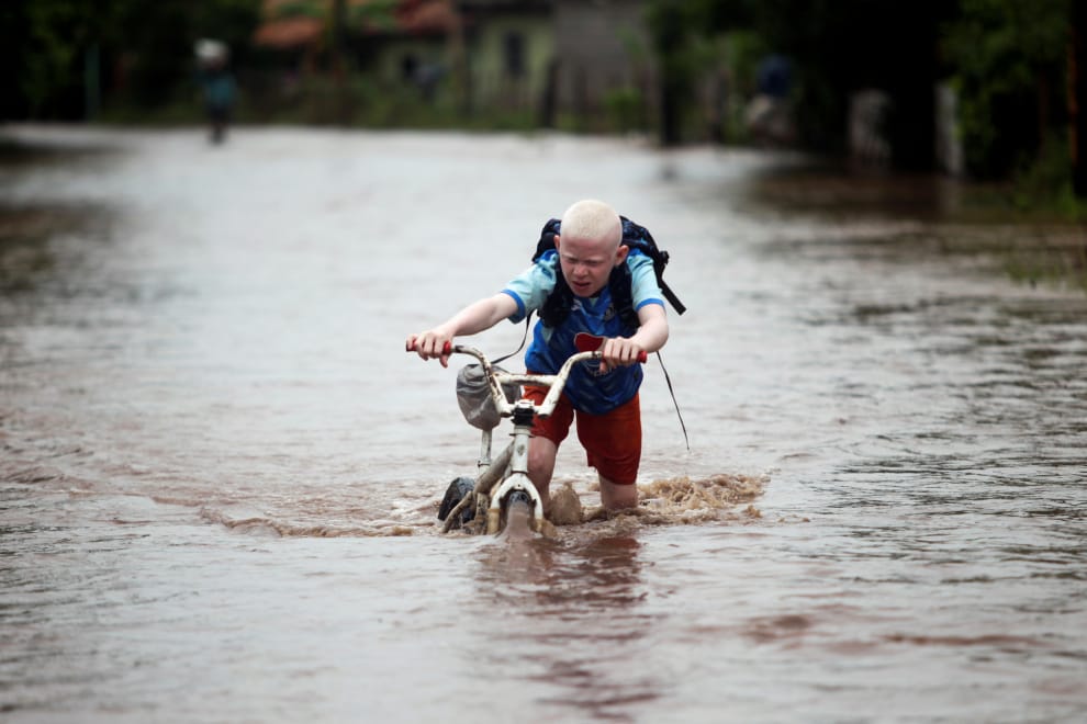 在宏都拉斯南部的馬爾科維亞鎮(Marcovia),一名小男孩在颶風約塔(Iota)帶來的洪水中,吃力地推著腳踏車前進。