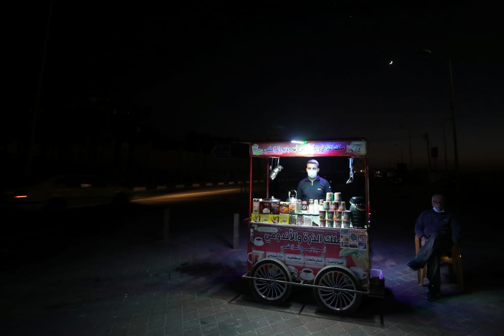在巴勒斯坦的加薩,一名巴勒斯坦小販在夜色中點起一盞燈做生意。