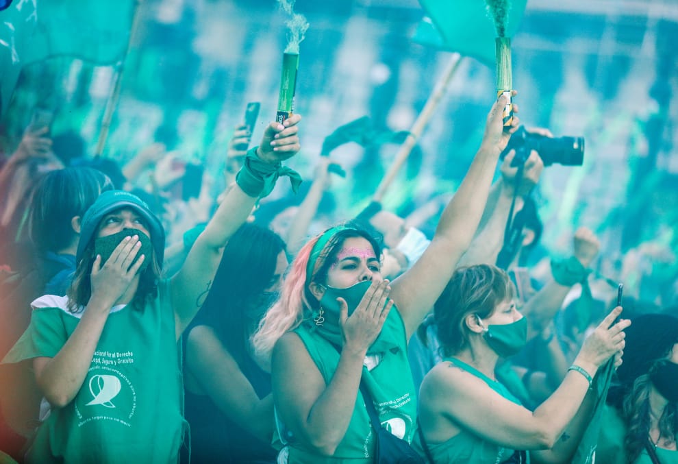 在阿根廷首都布宜諾斯艾利斯市,支持國會立法將墮胎合法化的民眾一同穿上綠衣,到國會大廈外表達訴求。