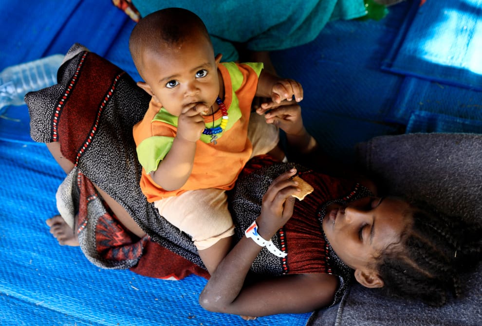 在蘇丹-衣索比亞邊境加達里夫省(Al-Qadarif)的烏姆拉科巴(Um-Rakoba)臨時難民營,一名自衣索比亞北部提格雷省(Tigray)逃難來的婦女,正在餵孩子吃餅乾。