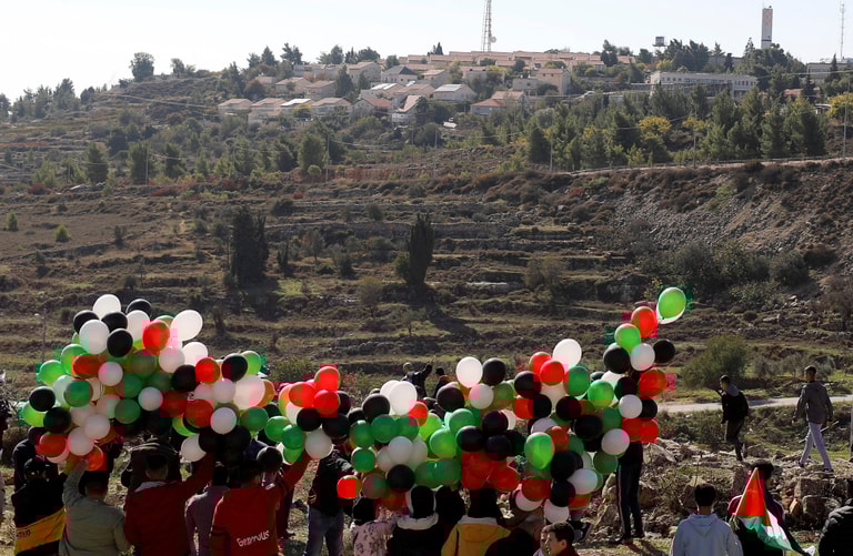 在巴勒斯坦約旦河西岸拉姆安拉市(Ramallah),以色列非法佔領區沙果(Psagot)附近,巴勒斯坦的示威者們聚集在一起準備施放氣球,以抗議美國國務卿蓬佩奧(Mike Pompeo)到訪以色列非法佔領區的行動。