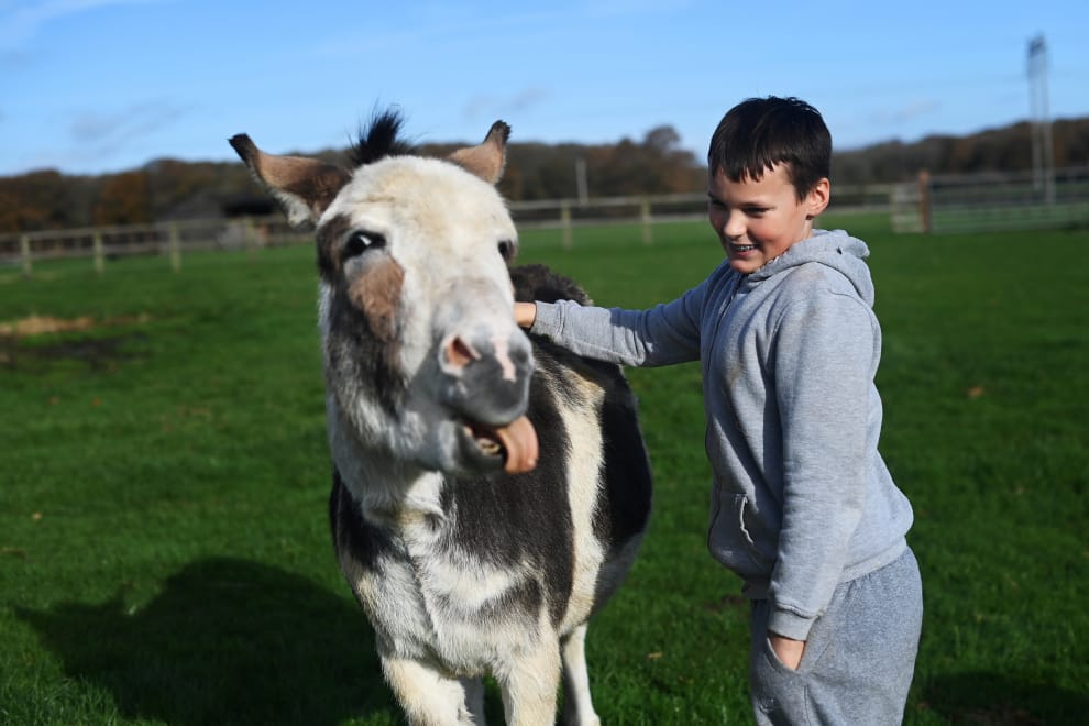 在英國西南部謝爾本市(Sherborne)的未來根源(Future Roots)農場內,菲(Harvey Fay)正在撫摸他最喜歡的驢子墨菲(Smurphy Murphy)。