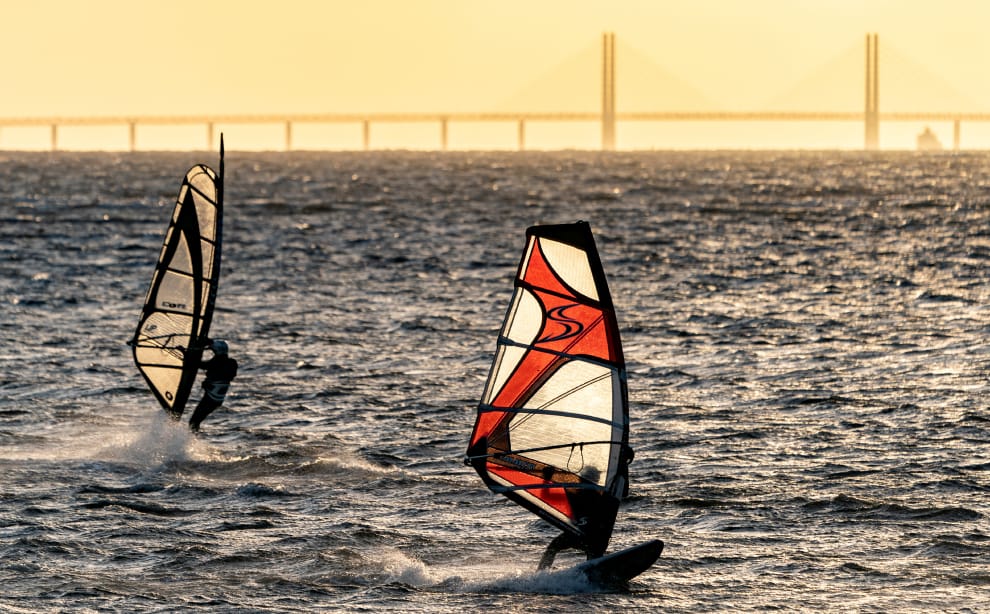 在瑞典南部的盧馬鎮(Lomma),兩名風帆衝浪(wind surfing)愛好者在松德海峽大橋(Oresund bridge)附近衝浪。