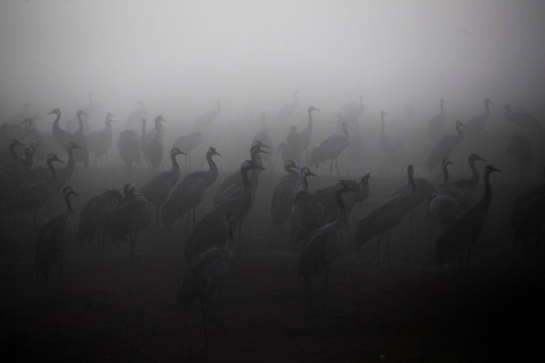在以色列北部呼拉自然保留區(Hula Nature Reserve),一個薄霧茫茫的早晨,一群鶴聚集起來,準備展開一年一度的冬季遷徙之旅。