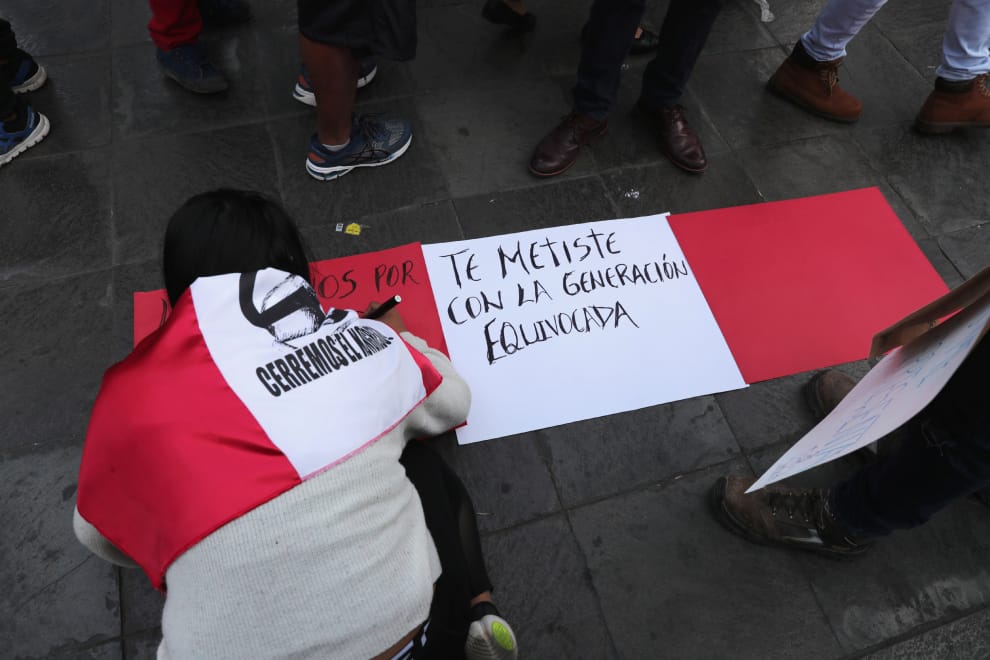 在秘魯首都利馬(Lima),一名示威者跪在地上,好在國旗上寫上標語:「你們惹錯世代了」(You messed with the wrong generation)。
