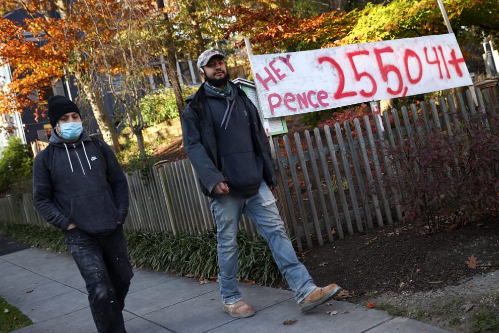 在首都華盛頓特區,一名男子經過一戶在前院立起「嘿彭斯,25,5041+」標語的房子。屋主想提醒美國副總統彭斯(Mike Pence),在美國總統川普(Donald Trump)和他執政期間,美國已經有超過 25萬5,041人因罹患COVID-19(武漢肺炎)而去世。
