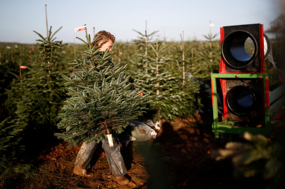 在法國西部聖瑪麗鎮(Sainte-Marie)的塔瓦爾森冷杉農場(Tavarson Sylviculture),一名工作人員正在搬一棵剛砍下冷杉,準備迎接不久後的聖誕熱銷期。
