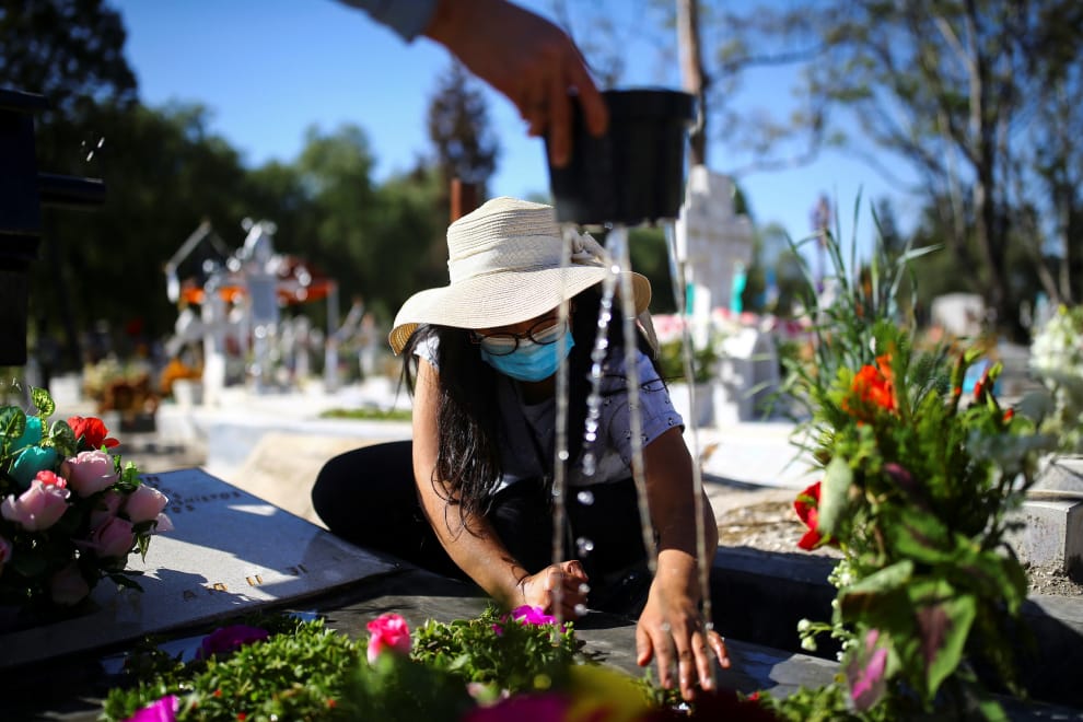 在墨西哥首都墨西哥市,米齊(Mitzi)前來替 86歲的奶奶納塔莉雅(Natalia)整理墳墓。今年 8月,娜塔莉雅因罹患COVID-19(武漢肺炎)而去世。
