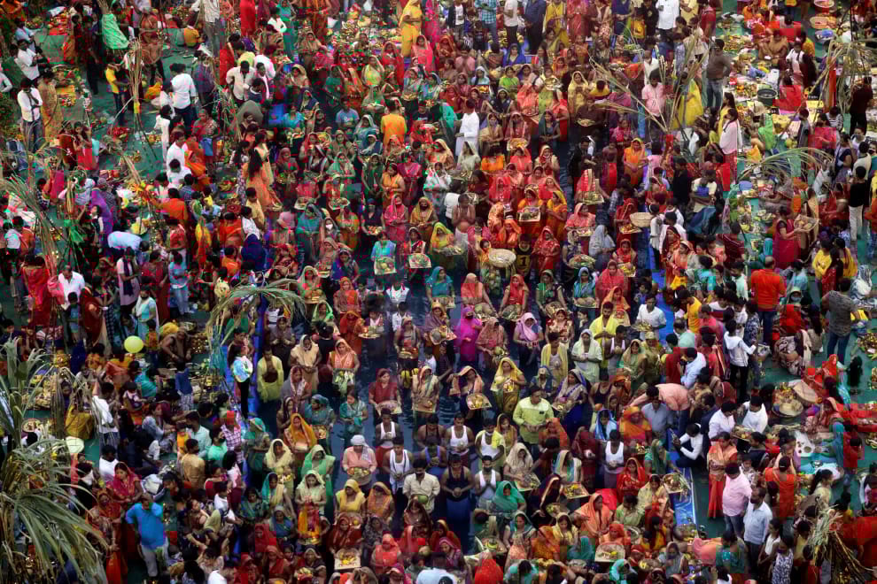 在印度大城孟買,信徒們在印度教節慶克哈特普迦節(Chhath Puja)這天,一同在人工水池裡參拜太陽神。