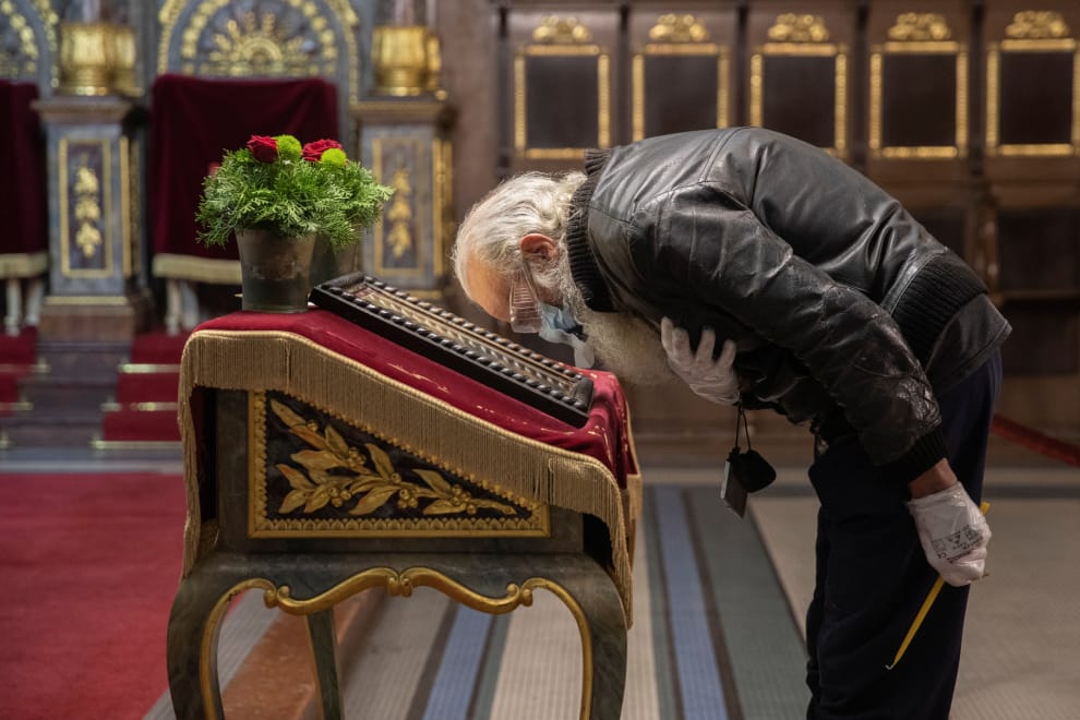 在塞爾維亞首都貝爾格勒(Belgrade),一名男子走進天使長主教座堂(Cathedral of the Archangel)裡,悼念前塞爾維亞東正教領袖愛任鈕(Patriarch Irinej),他先前因感染COVID-19(武漢肺炎)而去世,喪禮預計將於近日舉辦。
