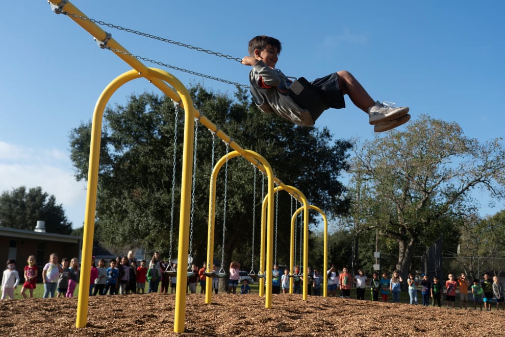 在美國德州的路易斯小學(Louise Elementary School),學校規劃了一場「重啟鞦韆」的儀式,在輪到 8歲的克羅斯(Croix Cortez)正在盪鞦韆,其他孩子們則在後方羨慕地望著克魯斯盪鞦韆的身影。