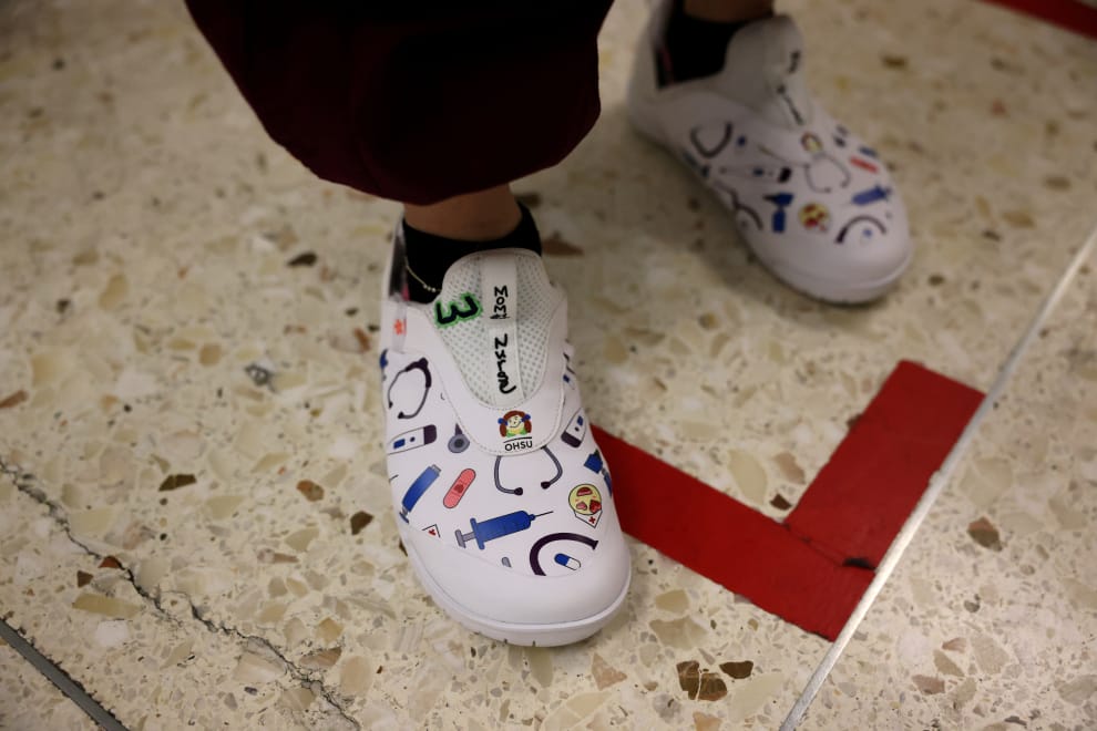 在美國加州的普羅維登斯聖約瑟夫醫療中心(Providence Saint Joseph Medical Center)內,一名醫護人員腳上穿著一雙由不同醫療器材插圖構成的鞋子。