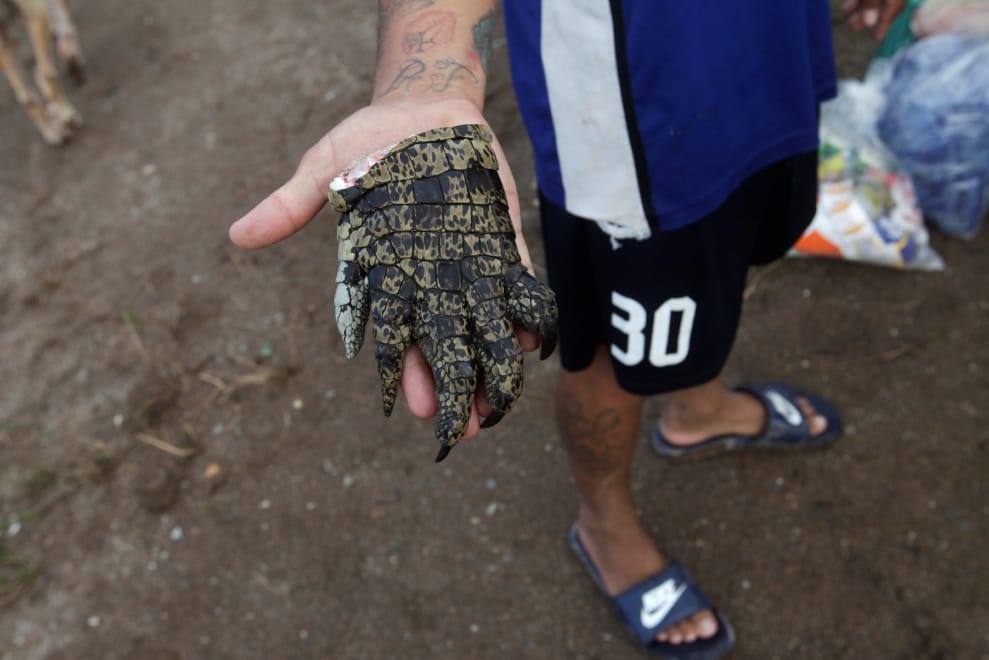 在宏都拉斯北部的埃爾普羅格雷索(El Progreso),颶風約塔(Iota)在當地造成水災,當地因而設立了不少臨時賑濟中心,免費發放食物幫助災民。在排隊等候的過程中,一名男子向攝影師展示手上的鱷魚殘肢。