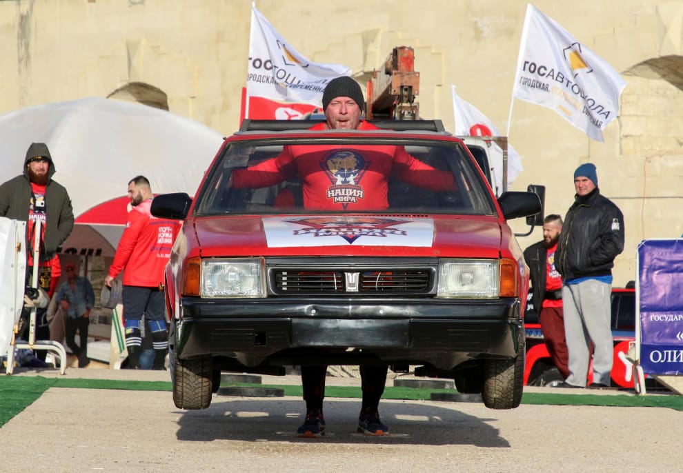 在「人力比機器」的重量比賽上,一名參賽者抬起車體奮力往終點線走去。