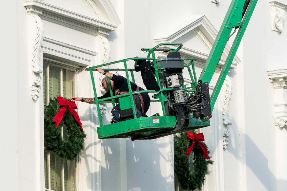 在白宮一角,一名工作人員在機具的幫忙下,忙著把白宮各個角落布置上充滿聖誕色彩的裝飾品。