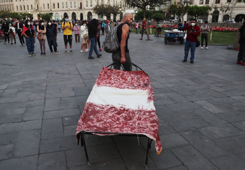 示威者拖著一張床來到首都利馬(Lima)的示威現場,床上披著象徵秘魯國旗的床單。