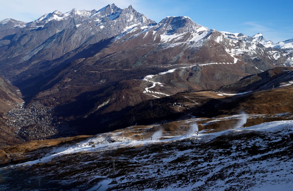 在策馬特(Zermatt)的滑雪度假村,製雪機在山谷之間努力運作著,希望能在滑雪季來臨前製造出令人滿意的雪量。