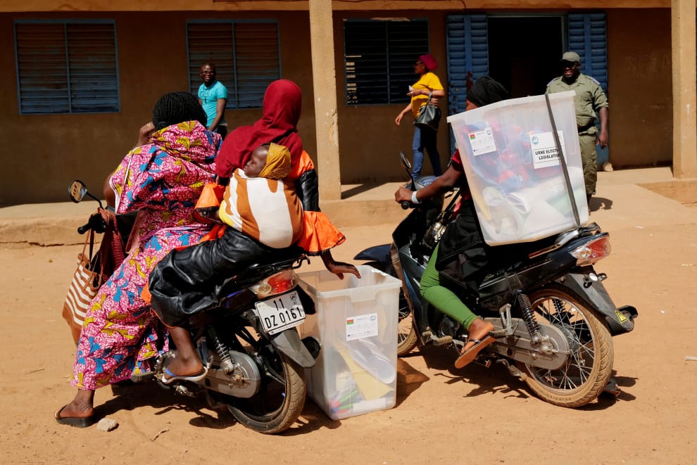 在首都瓦加杜古(Ouagadougou),票務委員載著票箱抵達投票所,這裡即將舉辦總統及立法委員選舉。