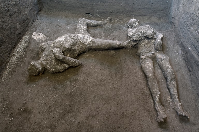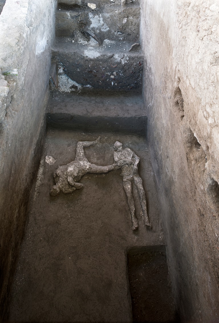 在維蘇威火山噴發後,高溫的火山碎屑會以迅雷不及掩耳的速度淹沒一切,在冷卻後則會形成硬殼。隨著時間經過,被淹沒的人體殘骸雖然會腐爛消失,但硬殼和骨頭之間所形成的空隙,讓考古學家能灌入石膏塑形,進而使龐貝罹難者的遺骸能更完整地被展現出來。這次被發現的兩名龐貝男子也已經被製成石膏鑄像。