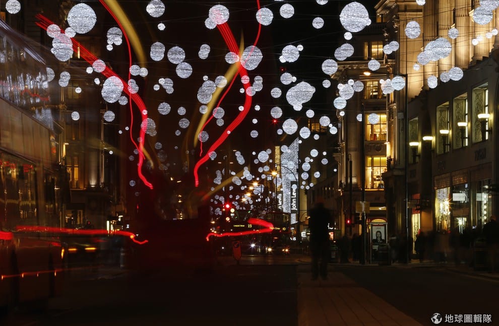 一輛巴士在劍橋大街的聖誕燈光下駛過
