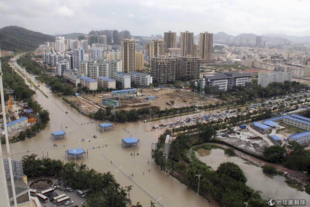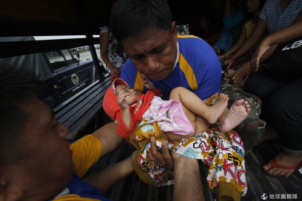 在救難團隊協助下,照片中的小寶寶和他的家人終於能逃出海燕颱風重創的災區