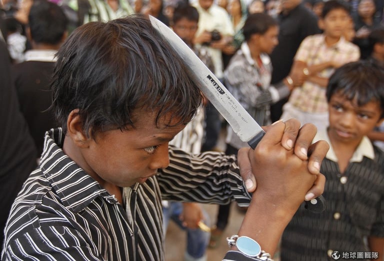 一名屬於伊斯蘭教什葉派的男孩,正拿著刀子割自己的頭。現在正是伊斯蘭教重要的「穆哈蘭月」(Muharram),這也是伊斯蘭教曆上的第一天,相當於我們常說的「元旦」。這天也是要紀念先知穆罕默德的孫子伊曼海珊(Imam Hussein)遭殺的日子,伊曼海珊在7世紀的時候,在一場戰役中被72的對手聯合打敗殺死。
