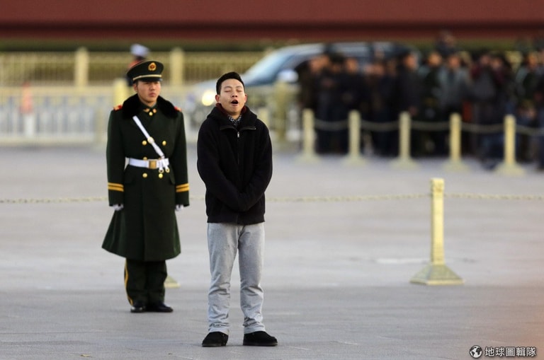 天安門廣場上,一名維安人員打著大大的哈欠,他身後則站著公安人員,兩人望過去的方向正在舉行升旗典禮。中國在近日會宣布他們接下來10年的改革政策,他們會在提高經濟發展還有強化共產黨權力兩者間找到平衡