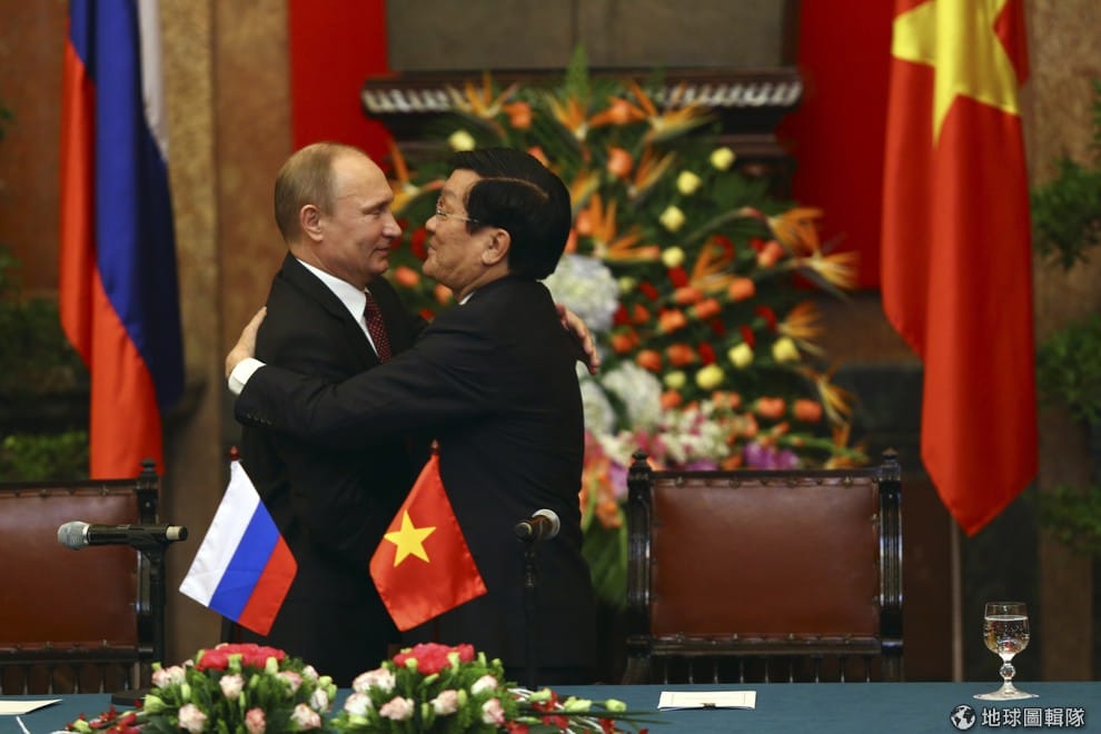 俄國總普亭(Vladimir Putin,圖左)和越南總統張晉創(Truong Tan Sang)在簽署完俄越兩國合作條款後,互相擁抱