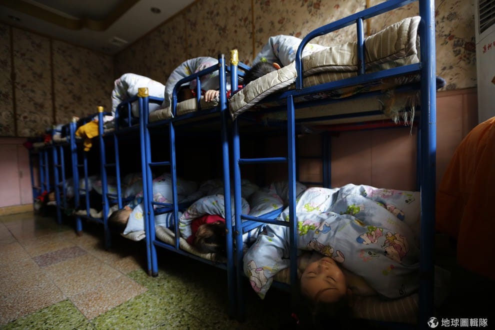 小朋友們正在北京城郊的一間幼稚園內睡覺。這間幼稚園主要提供給移民工的孩子們就讀。對中國領導人來說,幾項要面對的重要議題中,就包含了讓孩子們待在這樣的學校中是否真的是中國夢的一部分。對中國許多父母來說,他們為了找尋更好的生活來到大城市中,就放棄了原本家鄉中可以享受的權利,包含居住權、福利金、或是健保等等。