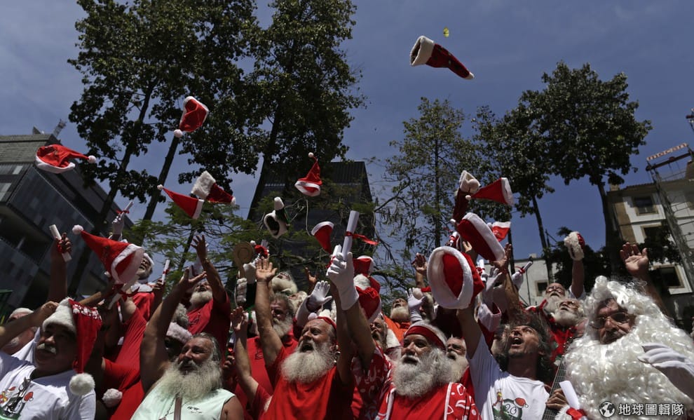 巴西聖誕老人學校的學生們在畢業典禮這天,把他們的帽子拋向空中。這間學校會舉辦為期4天的受訓課程,教學生們怎麼唱聖誕歌、和小朋友互動、還有要怎麼在平均溫度可達40度C的12月天中,持續穿著厚重的鮮紅外衣