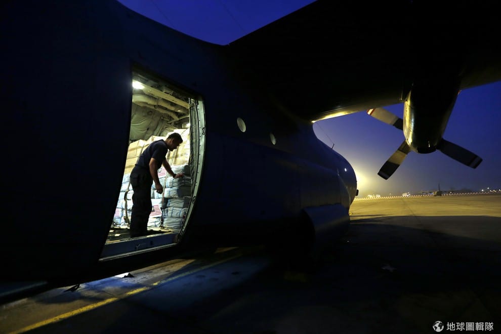 馬來西亞空軍的軍人正在把援助菲律賓的物資放到飛機上