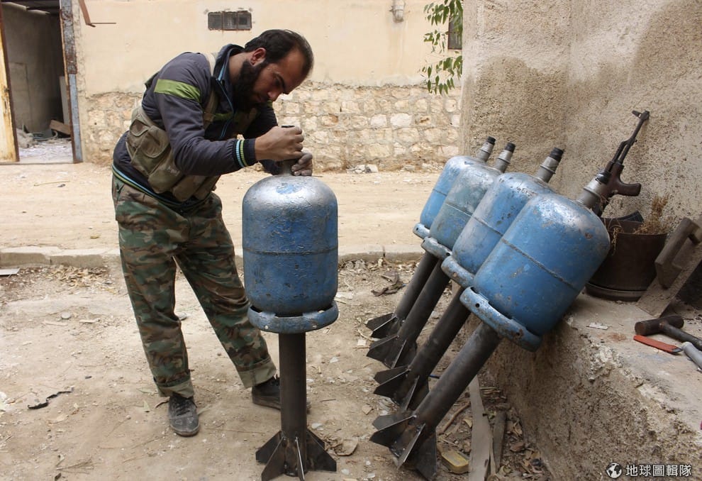 隸屬在敘利亞反抗軍下的「真主唯一旅」(Tawhid Brigade)的軍人正在確認他們自製的火箭砲,一會兒他們就要朝政府軍掌控的第80旅攻擊。上周日時,敘利亞北邊的反抗軍遭到政府軍逮捕,第80旅所在的基地受到政府軍掌控。