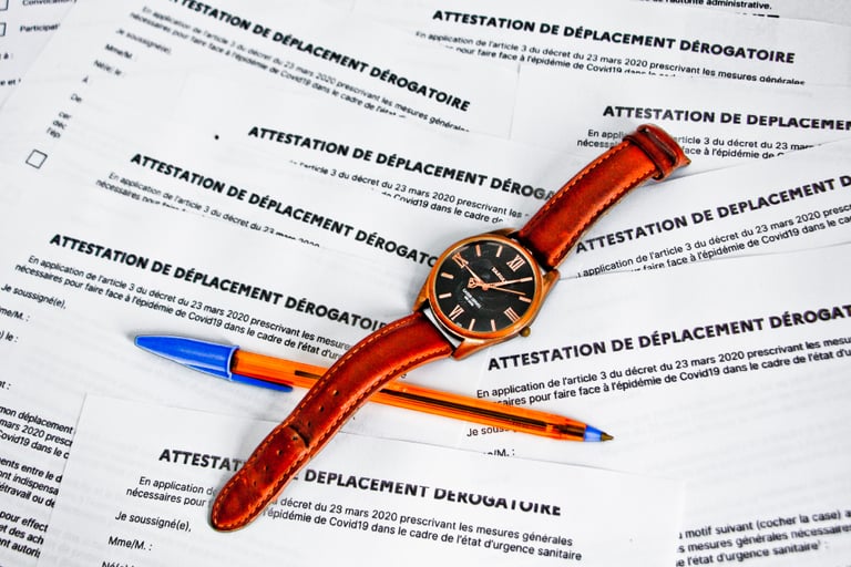 在防疫封鎖令下的法國,想要出門的民眾都必須隨身攜帶聲明書以供查驗,除了必須載明出門的理由外,還得留下全名、地址、生日、出生地跟離家的時間,這份聲明書也貼心地為民眾先羅列了幾個離家事由,像是採買必需品、看病、工作或是在方圓一公里內運動等,都算是合法的離家事由。