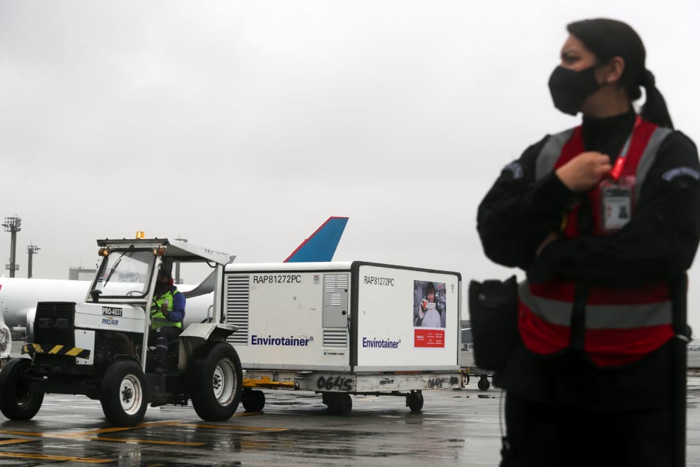 當疫苗抵達購買國家,運下飛機後,又是一場新的挑戰。圖為巴西聖保羅國際機場(Sao Paulo International Airport)的一名工作人員,正在運送一批中國生產的疫苗。