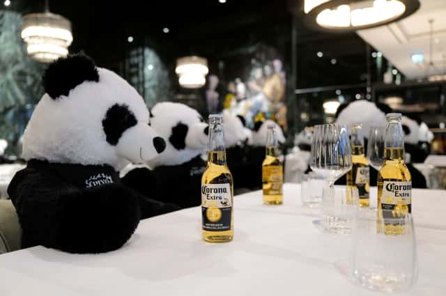 在法蘭克福(Frankfurt)餐廳「皮諾」(Pino)裡,義大利籍的餐廳老闆費切拉(Giuseppe "Pino" Fichera)替餐廳的座椅擺上一隻隻喝著科樂娜啤酒(Corona)的熊貓,對當局再次延長的封城政策表達無聲抗議。
