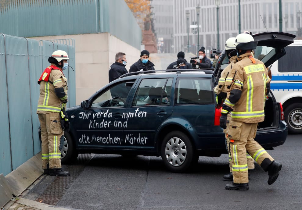 消防員忙著移開撞上德國總理梅克爾(Angela Merkel)辦公室入口的抗議車輛,車上的訊息寫著:「你這該死的孩童與老人殺人犯。」