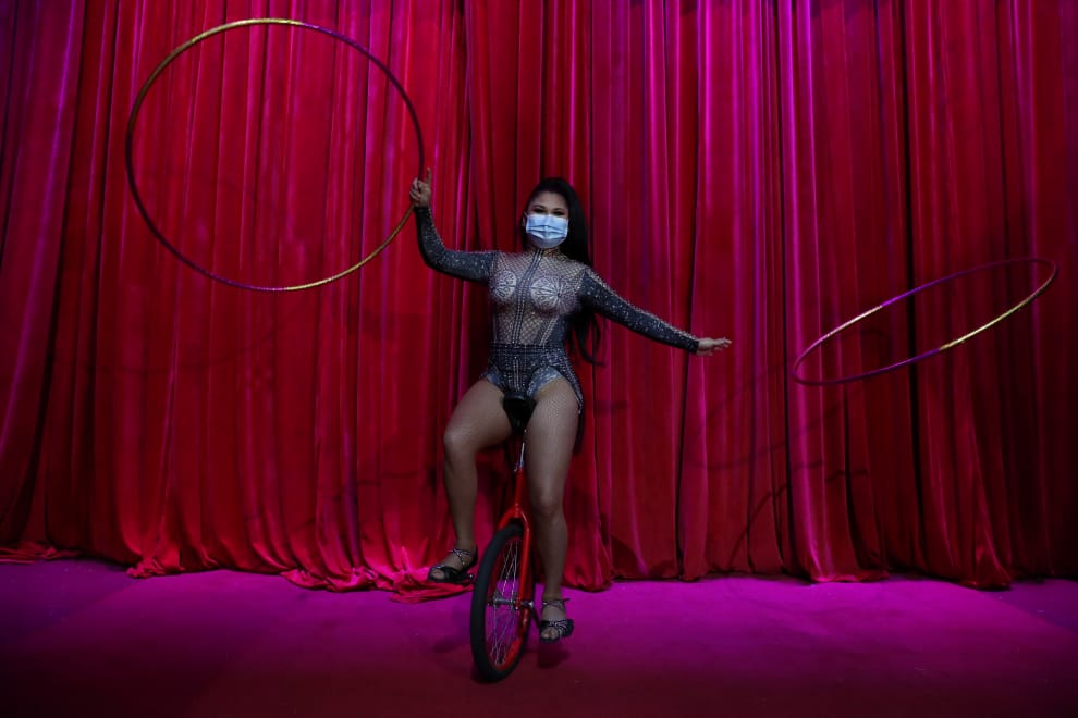 一名馬戲團團員在後台準備著自己的拿手好戲,她所屬的馬戲團將在符合COVID-19(武漢肺炎)防疫標準的情況下重新營業。