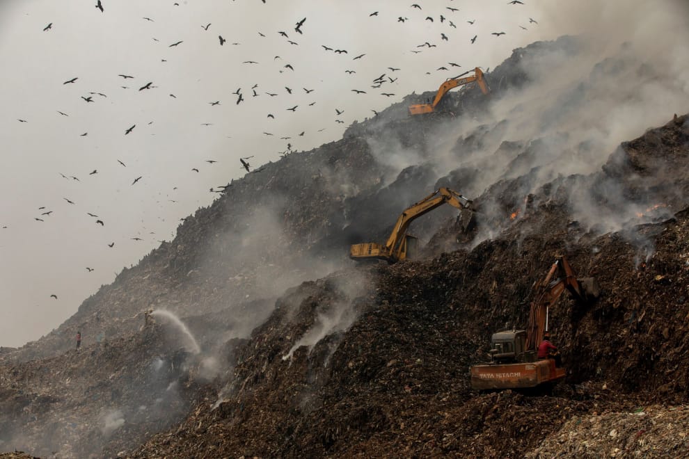 新德里一處垃圾掩埋場在焚燒完垃圾後,消防人員和操作怪手的工作人員忙著把餘火撲滅。
