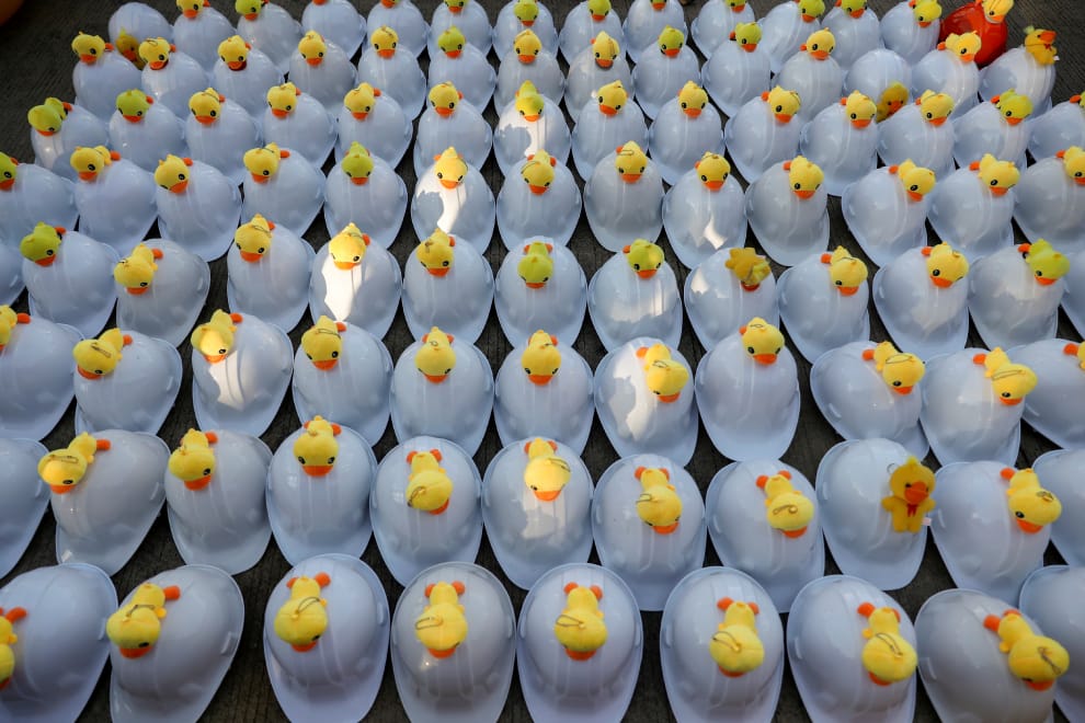 在曼谷的示威現場,大量被黏上黃色橡皮鴨的安全帽被攝影師捕捉了下來。前一陣子,泰國示威者會使用小鴨游泳圈來抵擋鎮暴警察的水砲,因而讓黃色小鴨成為示威者的抵抗象徵。