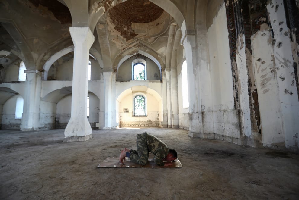 在一間清真寺裡,一名亞塞拜然士兵趴在地上祈禱。