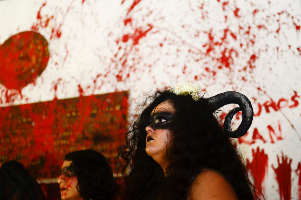 在首都聖薩爾瓦多(San Salvador)現場,許多女性在身上畫上血痕,希望人們重視女性受暴議題。這天是國際消除對女性使用暴力日(International Day for the Elimination of Violence against Women)。