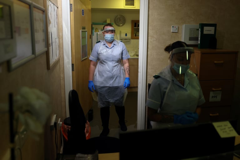 在一間位於倫敦的護理之家裡,兩名資深的照護人員準備幫住在這裡的人們進行 30分鐘就能驗出結果的COVID-19(武漢肺炎)篩檢。