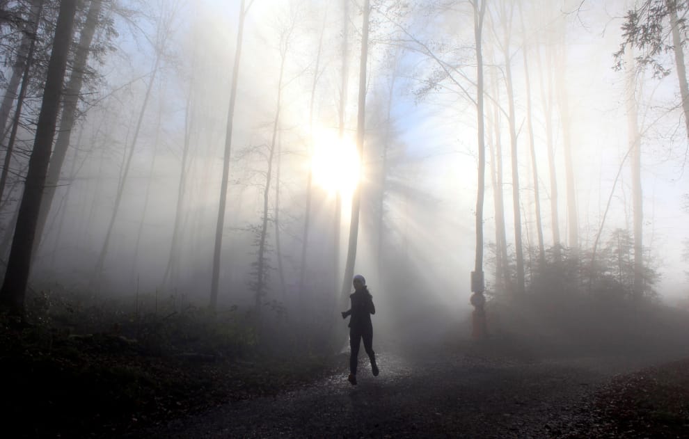 在蘇黎世(Zurich),一名女子在薄霧環繞的森林中慢跑著。