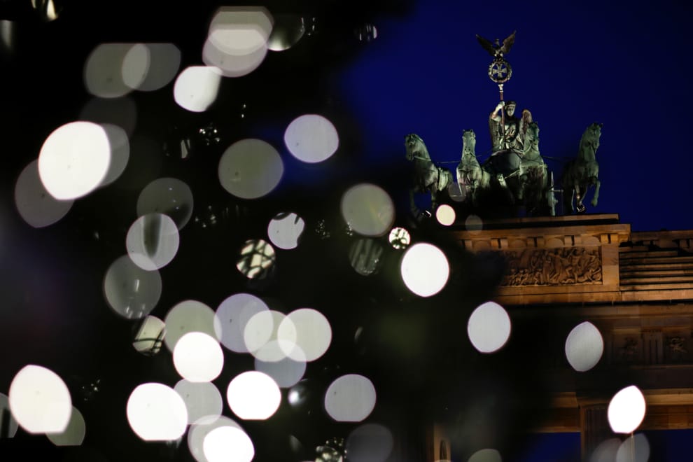 在柏林的布蘭登堡門(Brandenburg Gate),一棵被點亮的聖誕樹照亮了布蘭登堡門前的廣場。