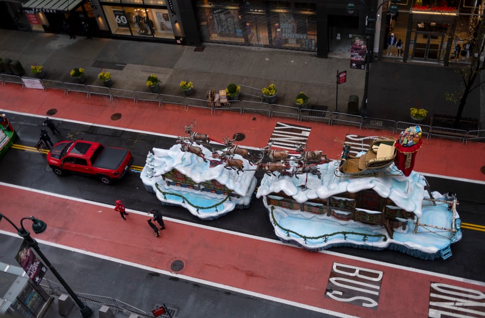 在紐約街頭,聖誕造型的充氣氣球經過了空無一人的街道。