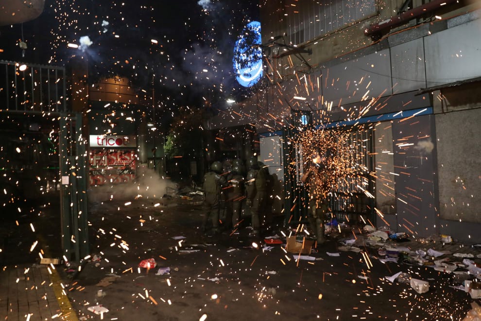 在首都聖地牙哥(Santiago)的反政府抗議現場,示威者朝鎮暴警察的方向施放煙火,試圖干擾鎮暴警察的驅離。