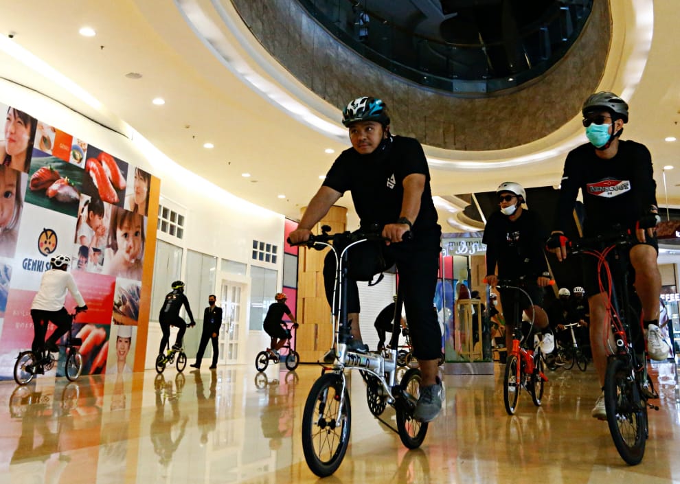 在雅加達一棟百貨公司裡,面對這裡因為COVID-19(武漢肺炎)疫情導致顧客稀少,百貨公司索性把一部分的地方規劃成腳踏車遊樂區,讓大家有不一樣的騎車體驗。