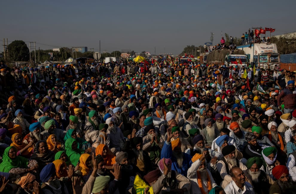 在德里(Delhi)與哈里亞納邦(Haryana)的交界地帶,數以百計的農夫聚集在此示威,且不斷有農夫搭車前來加入示威。