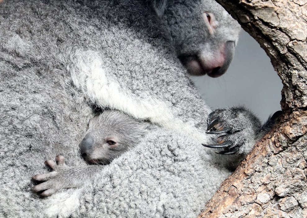 在一座位於蘇黎世(Zurich)的動物園裡,一隻幾個月大的小無尾熊依偎在媽媽懷裡。
